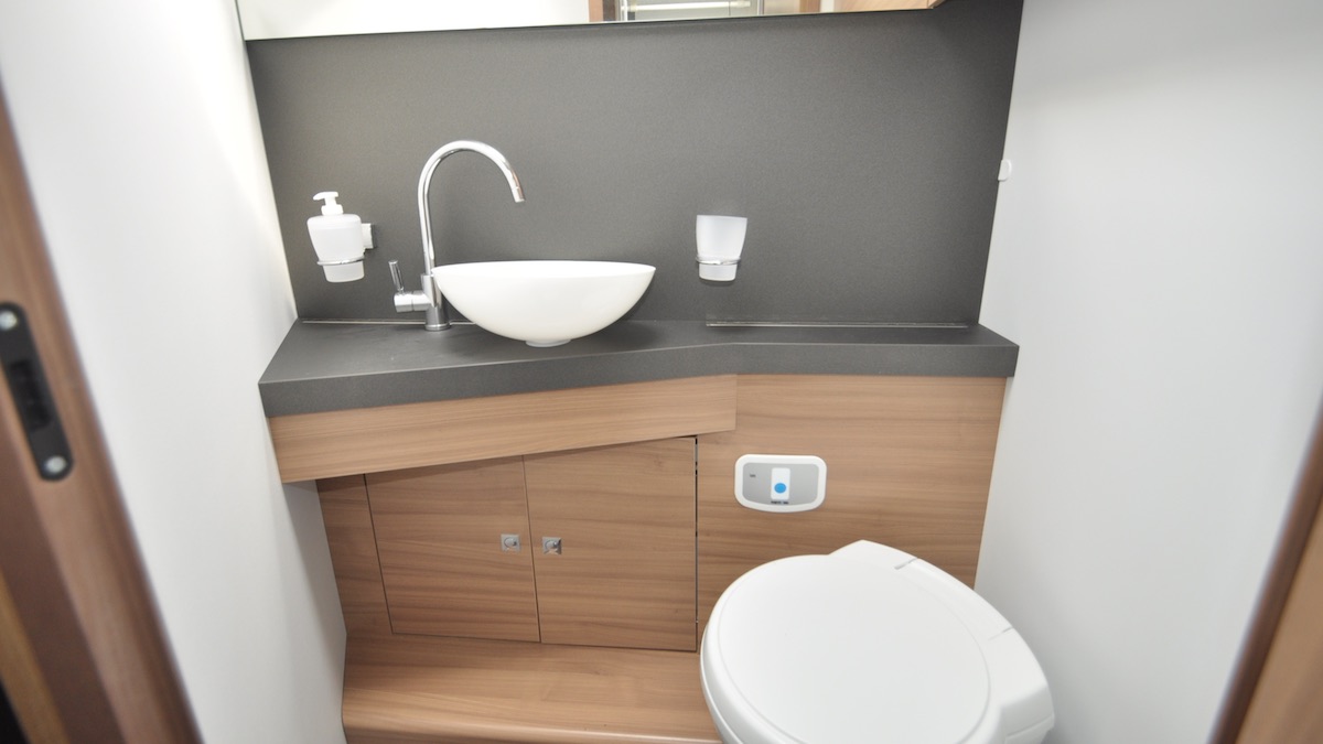 The WC is home to a Thetford swivel-bowl toilet and a counter-top basin, the latter flanked by a toothbrush mug and soap dispenser. There’s excellent locker storage plus a wide, illuminated mirror.