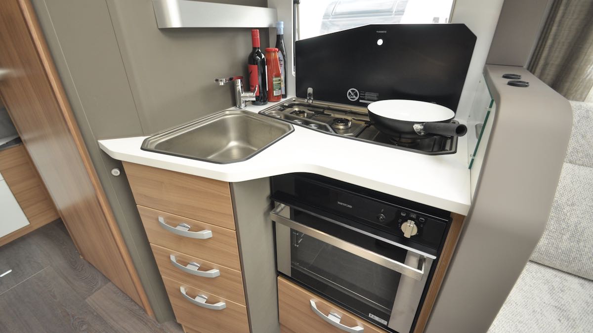 On first inspection the kitchen seems rather compact and maybe you’ll be a bit disappointed if you like a food preparation area with plenty of permanent worktop. But there are plenty of positives. The hob – boasting three different-sized gas rings in a line – is an efficient use of space, allowing for some work surface in front.