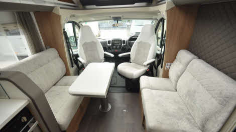The daytime arrangement of twin short settees either side of a sturdy, adjustable, fixed pedestal-leg table works well. The gloss white table-top itself is hinged in the middle and can be easily tipped out of the way if you need access to the cab. Meanwhile, the cab seats swivel seamlessly and there is a nice flat floor throughout the living area.