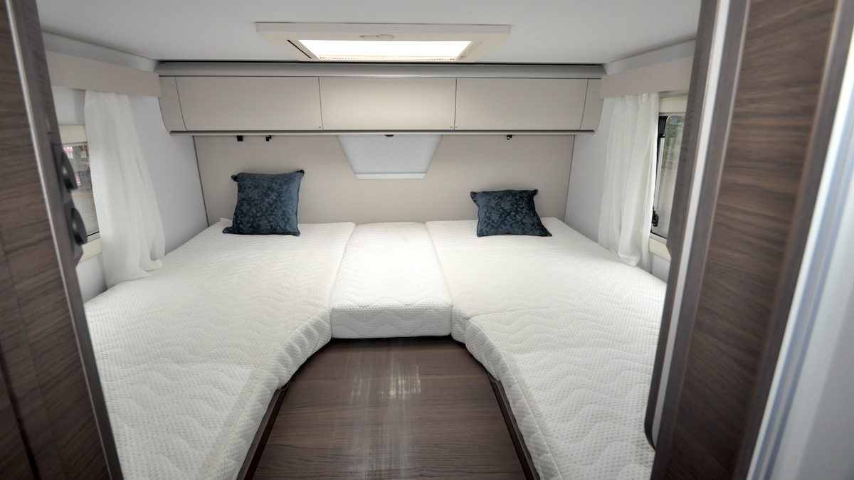 The rear sleeping area boasts two permanent singles (6ft 5in x 2ft 9in at their widest) along with an infill that can be added if you’d rather set up a double. Mattresses are high-quality EvoPore foam with adjustable upper sections if you’d prefer to be more upright.
