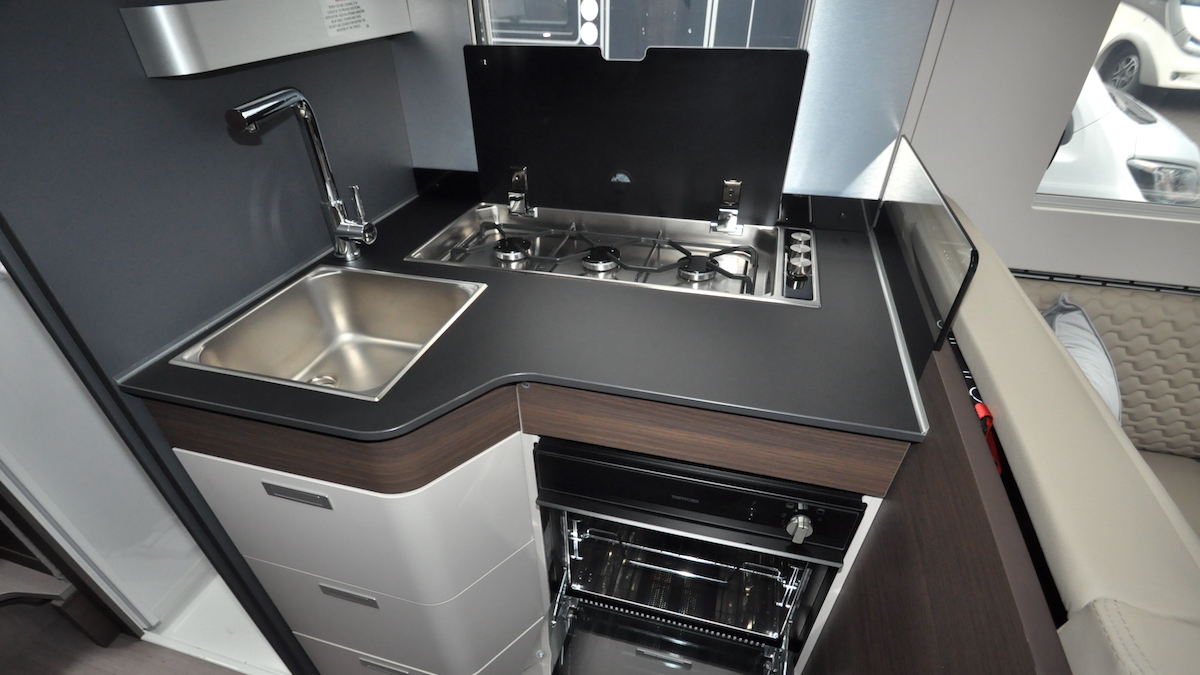 That trio of gas burners has become a hallmark of Adria kitchens. It’s an efficient use of space, allowing for a handy worktop in front of the hob.