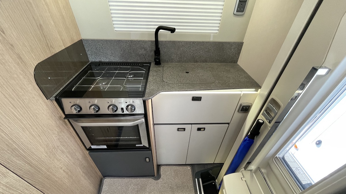 It’s all very neatly done in the kitchen, where the Thetford Triplex cooker (three gas burners, combined oven and grill) sits alongside an inset stainless steel sink and cover. The microwave oven is housed directly over the hob (not everyone’s favourite location) while a drawer under the sink includes its own slide-out cutlery tray – although this did have a propensity to fly open when travelling over bumps in the road.