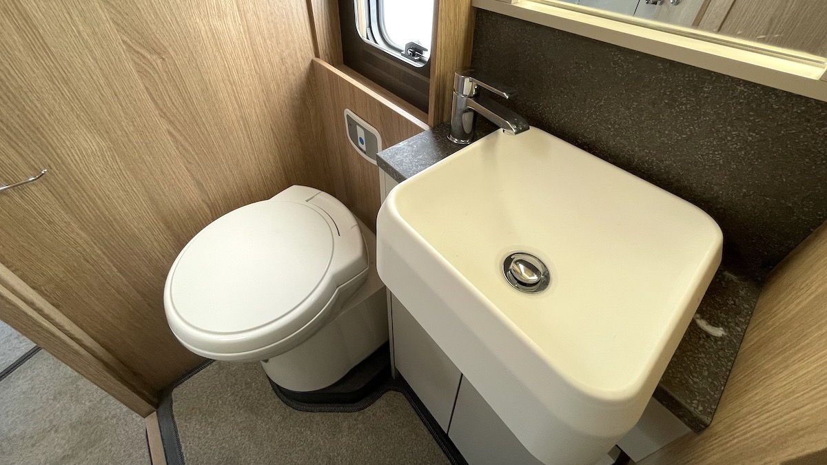 Again, there’s more space than you might expect in a 6.2m-long motorhome, with sufficient room in the washroom for a separate shower cubicle with plastic wall linings. You also get a swivel-bowl toilet and a fixed basin, plus an all-important opening window.