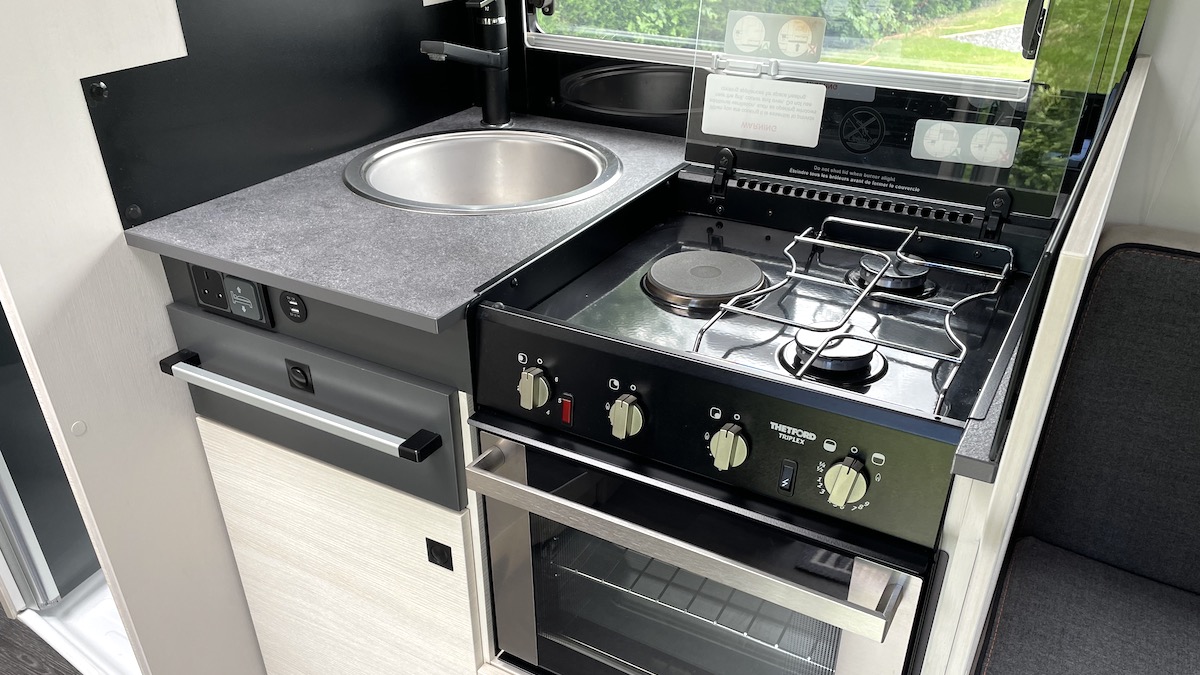 Kitchens in imported motorhomes tend to sport the bare minimum in terms of both equipment (large fridges excepted) and worktop space. Here, we have a space-efficient Thetford Triplex cooker with two gas burners and an electric hotplate, plus a combined oven and grill.