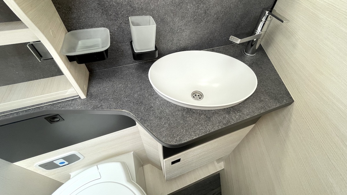 Typically for a rear-island-bed layout, the washroom facilities are split – there’s a toilet room on the offside and a shower cubicle nearside. The latter is fully lined, with the shower on a riser bar, twin plugholes and a drop-down rail for hanging wet attire.