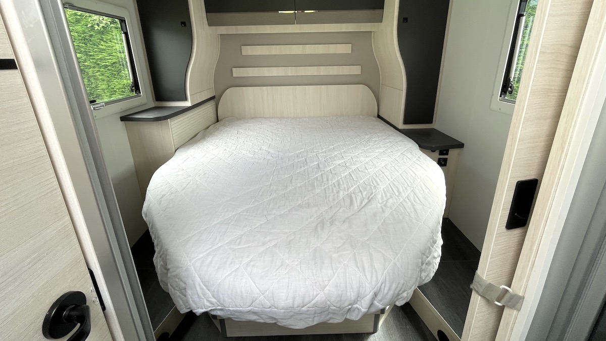 In the lounge, the electrically-operated drop-down bed comes part-way down (in theory, you can still use the lounge beneath) and a clip-on ladder provides access. Again, it’s a decent size and very comfortable, but do note it cuts across the habitation doorway.
