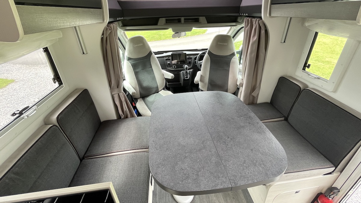 All the daytime seating is at the front, with sufficient room for a full complement of four to sit at the fixed pedestal leg table. The height of the table can be adjusted and it can be moved fore and aft. The top is hinged down the middle so it can be folded out of the way when required. Unfortunately the cab chairs do not sit at the same height as the settees, and the upholstery and cushioning feel a bit basic.