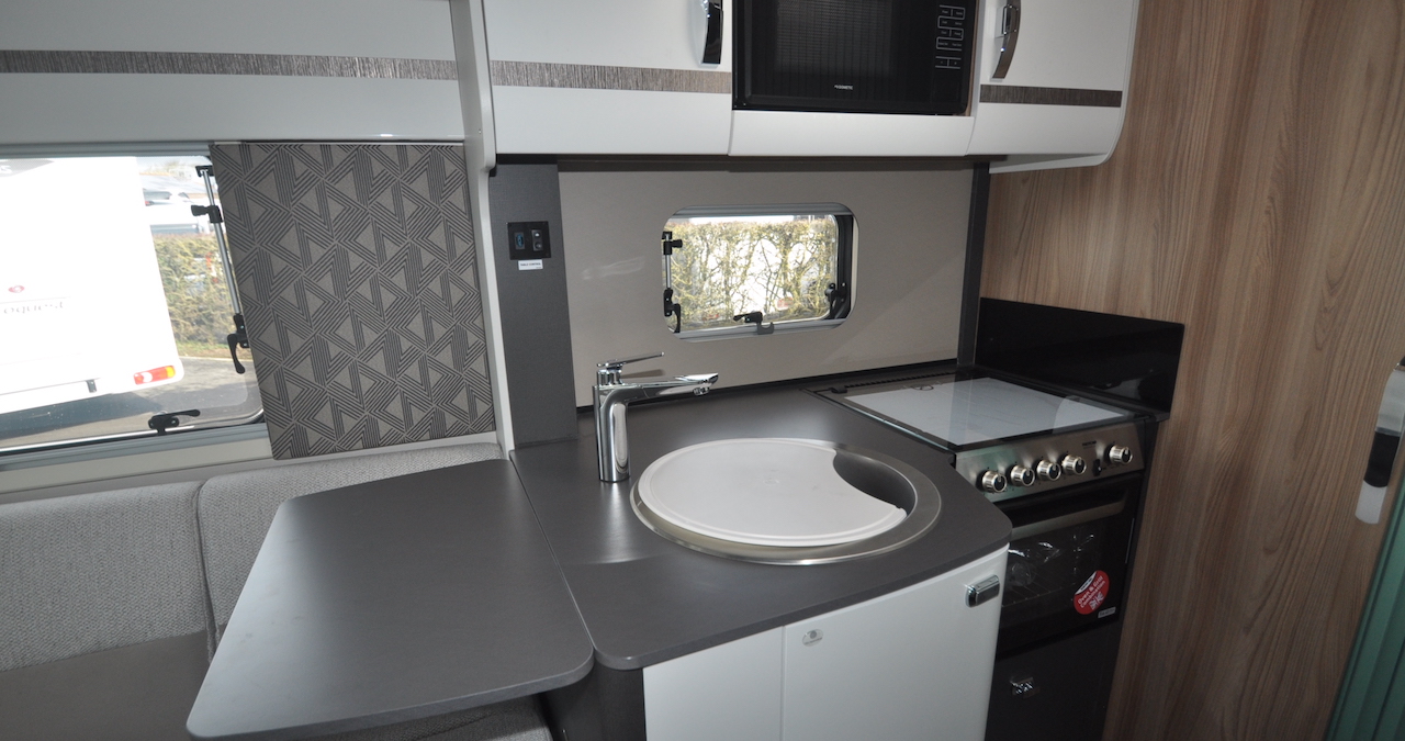 Located towards the back on the offside, the slight L-shape to the main unit here creates more worktop and lower-level storage space. There’s a Thetford Triplex Plus cooker with three gas rings and an electric hotplate, as well as a combination oven/grill. The large stainless steel sink has a loose cover that can also be used as a chopping board, plus there’s the usual add-on plastic drainer.