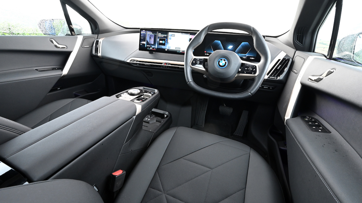 It feels spacious up-front as well. BMWs traditionally have a cocoon-like feeling with the dashboard wrapped around the driver, but there’s acres of room in the iX. There are plenty of interesting details, too, such as the square-ish steering wheel that would make an Austin Allegro driver smile, and a centre console that appears to float between the two front seats.