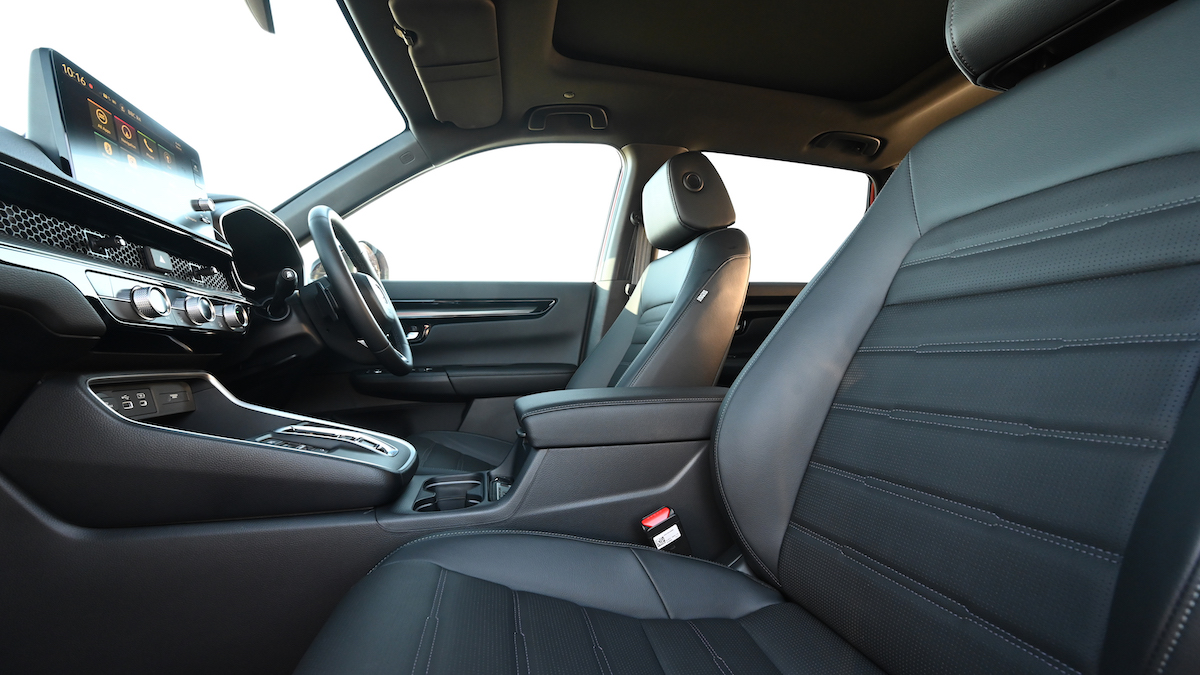 You sit high up in the CR-V, which isn’t always a given in an SUV these days, and this really helps with visibility and manoeuvring; back seat passengers sit even higher and have a great view. The floor is practically flat, meaning three can squeeze in if need be, and kneeroom is excellent. Every CR-V gets a panoramic glass roof, adding a touch of luxury, but this eats into headroom and consequently results in a slightly claustrophobic feel. Happily, the seat backs can be reclined in eight positions, helping to alleviate this sensation, while all of the seats can slide forwards and backwards to maximise leg or boot room. Speaking of which, space in the boot is good – unusually, the plug-in hybrid has more room than the full-hybrid at 635 litres versus 596. It’s worth noting that, unlike older versions of the CR-V, this generation is just a five-seater – there is no seven-seat option.