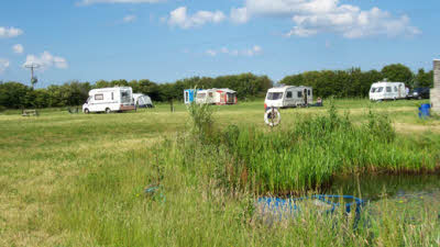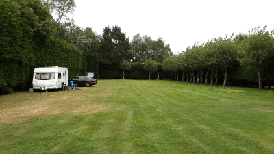 The site is in a fenced field and the pitches are lawned with electric hookups and have a space for awnings and are surrounded by trees and hedging.