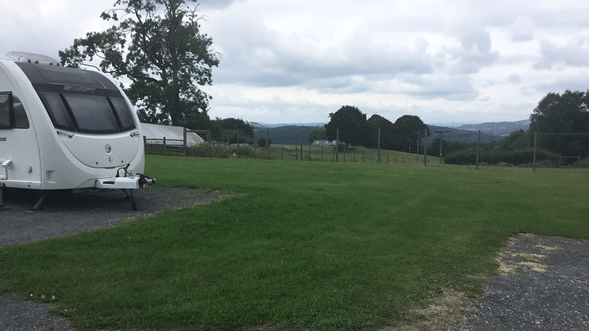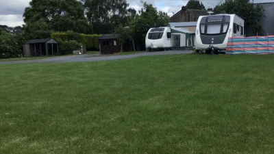 There are four large hard standing pitches with 6 foot hedges between, each one having metered electric hookup and water tap/hookup, The fifth pitch is on grass, also with elec & water hookup