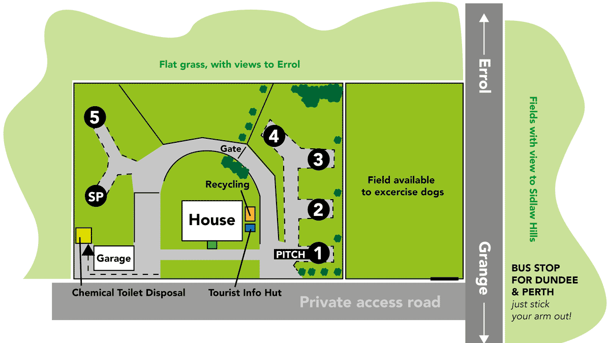 Fernlea certificated location (CL) is situated within the farmland of the Carse of Gowrie, Perthshire with stunning views presented all around. It comprises of hardcore access road, two flat paddocks with 5 hard standings and grass areas plus electric points and water on all pitches. This is an adult only site and dogs are welcome if kept under control. We also have a adjacent field available to exercise you dog. Please note, we have no toilets, but do have a chemical waste disposal point.
