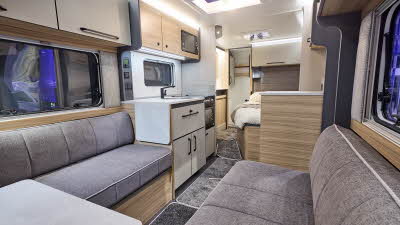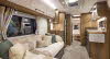 Judge's comment on the winning Swift Challenger 390: "A compact design ideal for a couple. I like the interior decor of muted warm colours. Practical features to make life easier such as the spring hinges on seats and sliding slats on a track to make up the bed quickly. Great to see sprung cushions for comfortable seating and good night’s sleep."