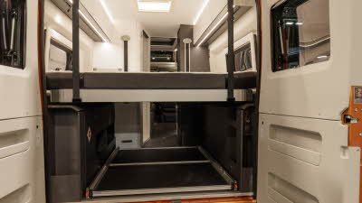 - Layout: central kitchen / central washroom / fixed rear single beds / front drop down bed