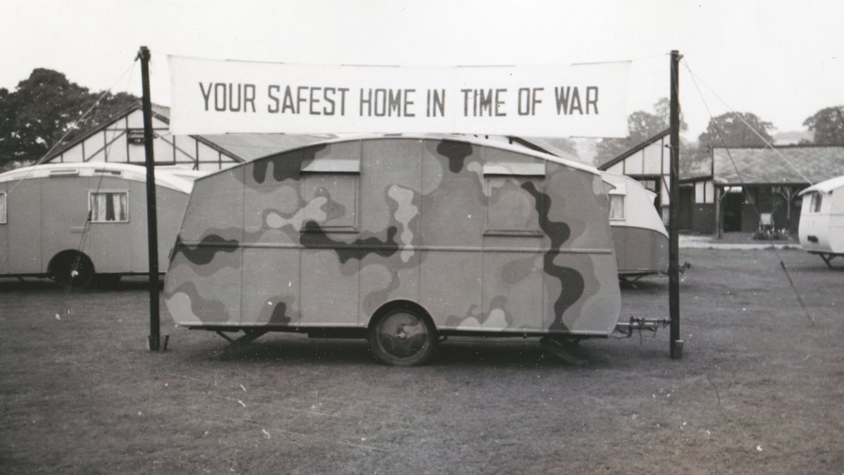 A camouflaged caravan advertised as the ‘Safest Home in Time of War’, 1940